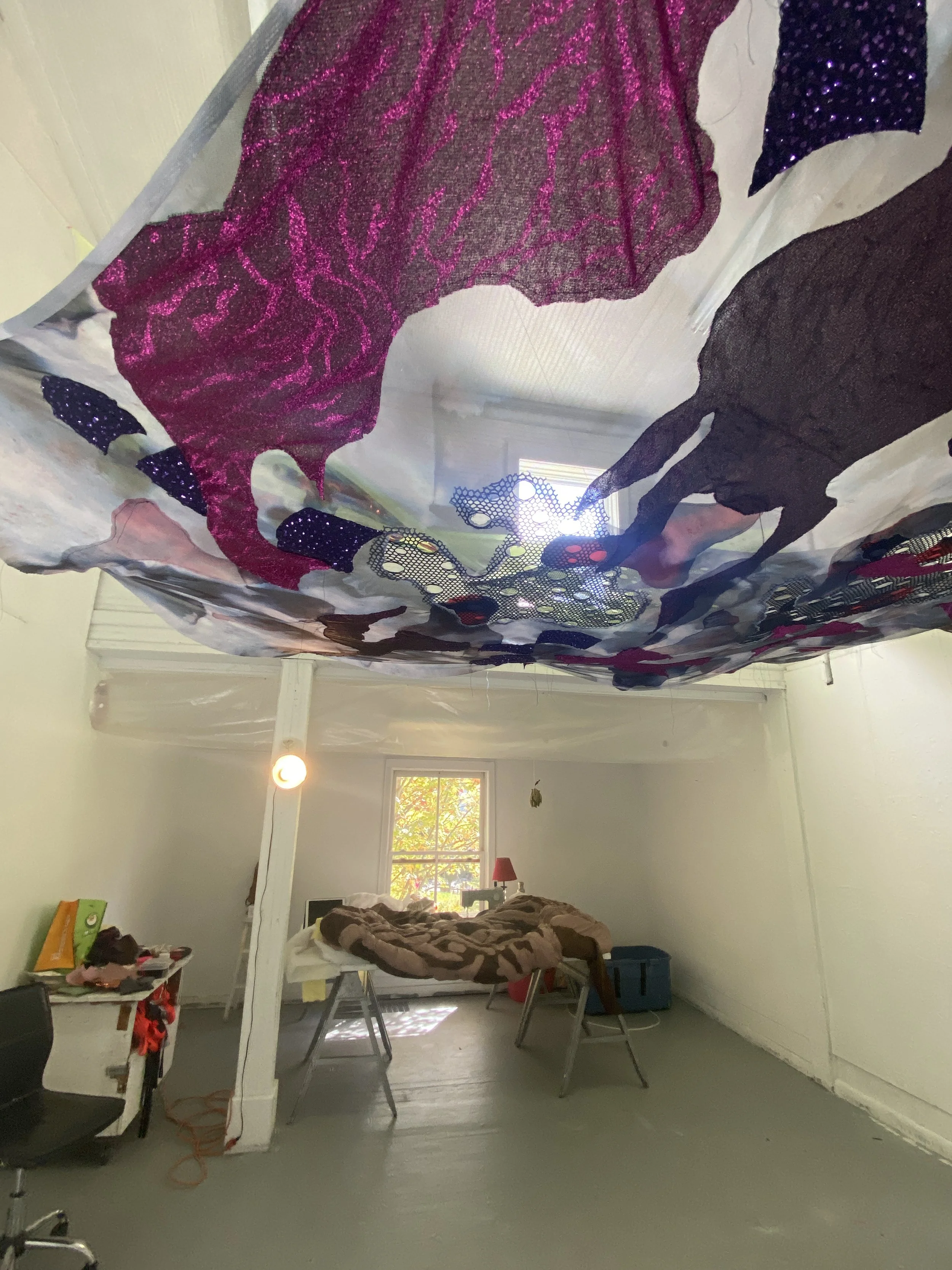 Vermont Studio Center in Johnson VT, from September 8-26, 2025. At the VSC Residence Program I was able to make new work inspired by my surroundings nestled in the small rural town of Johnson. I was surrounded by Fall colours of vast tall growing trees and natural streams and glittering rock faces. Being in nature in this new space made me consider what it means to escape your "home life" and the elements such as the extreme forest fires and smoke that blew in from the north just as I was leaving for my residency. I made 2 large-scale canopy pieces made of fanciful fabrics entitled Blood-moon / Milky Way, to honor the devastation that northern communities were facing and air pollution that blanketed Saskatchewan. This was such a contrast to the clean humid air of Vermont. I was especially taken with the closeness to the Milky Way and the clear night skies. My work paid homage to the elemental contrast of the 2 very different night skies. One represents the clear starry galaxy and the other beautiful but ominous with casts of reds, depicting smoke from the atmosphere onto the moon.
